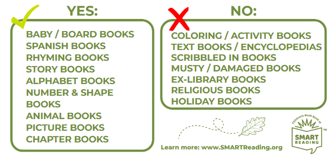 We are now accepting donations of new and gently used children’s books by appointment Monday through Friday at our Bend office. To schedule a book drop off, call 541-797-7726. SMART Reading is located at 1029 NW 14th Street, Suite 101, Bend, OR 97703.